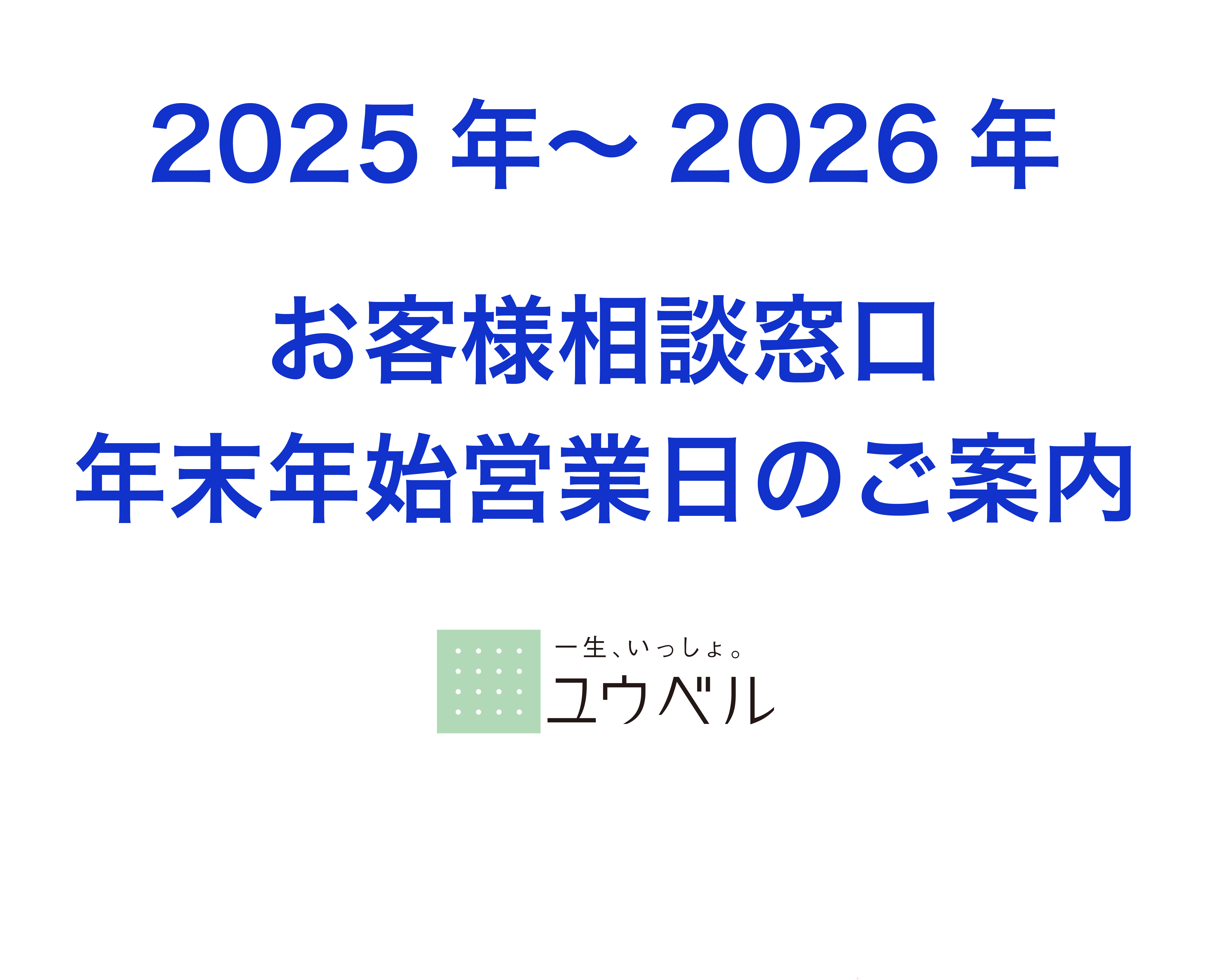 2025年~2026年 年末年始 お客様相談窓口営業日のご案内 【 2025年~2026年 年末年始 ユウベルお客様相談窓口営業日のご案内 】 …… ユウベルグループ 会員様サービス窓口営業日時のお知らせ ~ ユウベルグループ 会員様サービス窓口営業日時のお知らせ ~ 平素よりユ…… ユウベル互助会の【一部利用サービス】ご案内 .aligncenter{ text-align: center; marg……